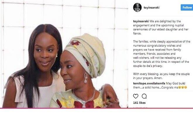 The Senate President, Bukola Saraki and his wife, Mrs Toyin Saraki are set to give out their eldest daughter, Tosin,25 years old, out in marriage. The announcement was made on social media page byMrs Toyin Saraki, the founder of WellBeing Africa Foundation, adding that the family will not be releasing further details about the upcoming nuptial, "in respect of the couple-to-be's privacy."